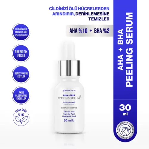 Biobellinda AHA/BHA Peeling Serum, cildinize derinlemesine bakım sağlayarak pürüzsüz ve sağlıklı bir görünüm kazanmanıza yardımcı olan bir serumdur. Gelişmiş formülü sayesinde cildin üst tabakasını nazikçe soyarak, cildin kendini yenilemesine ve canlılık kazanmasına destek olur.